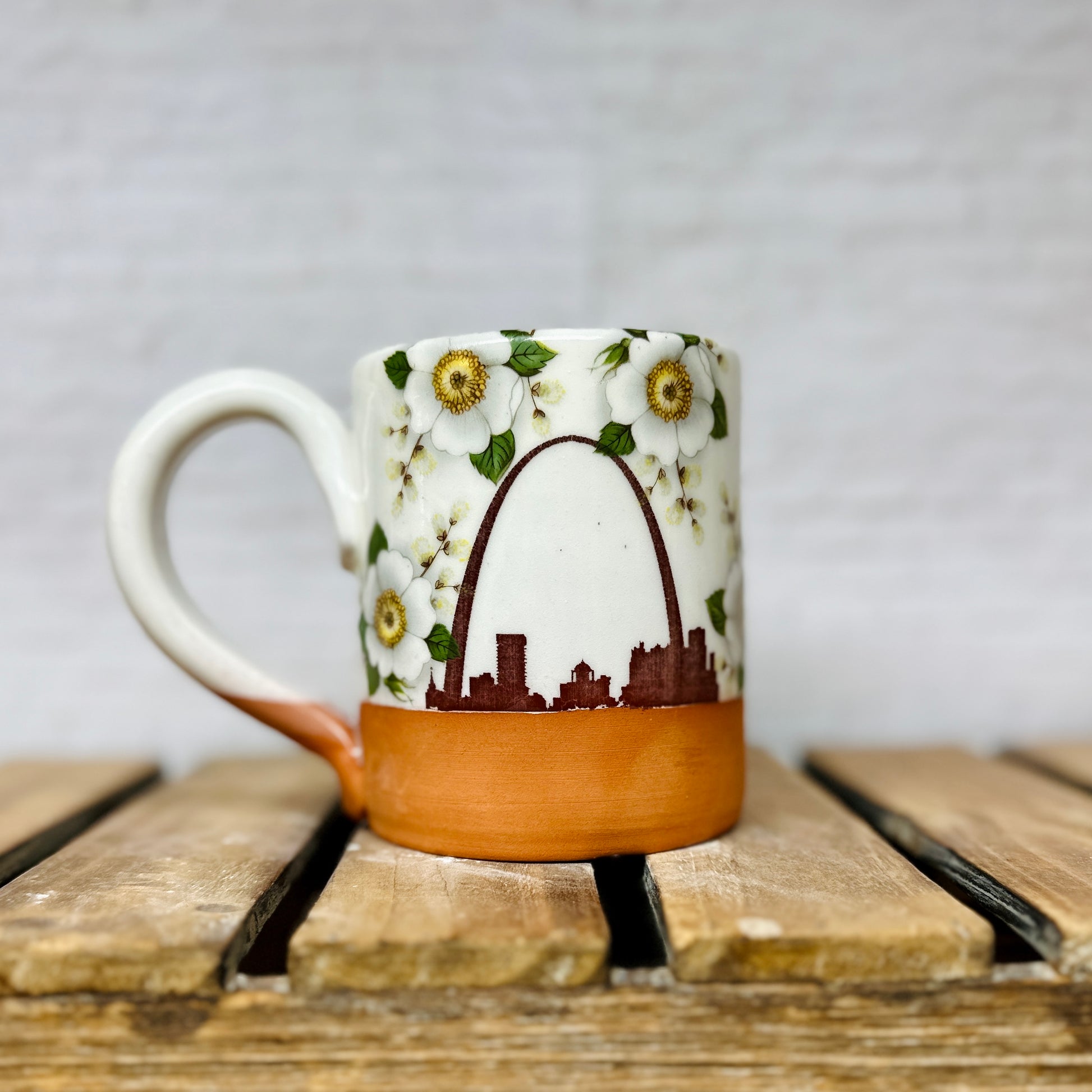 Handmade ceramic mug, thrown on the pottery wheel featuring the iconic STL Arch and beautiful floral details