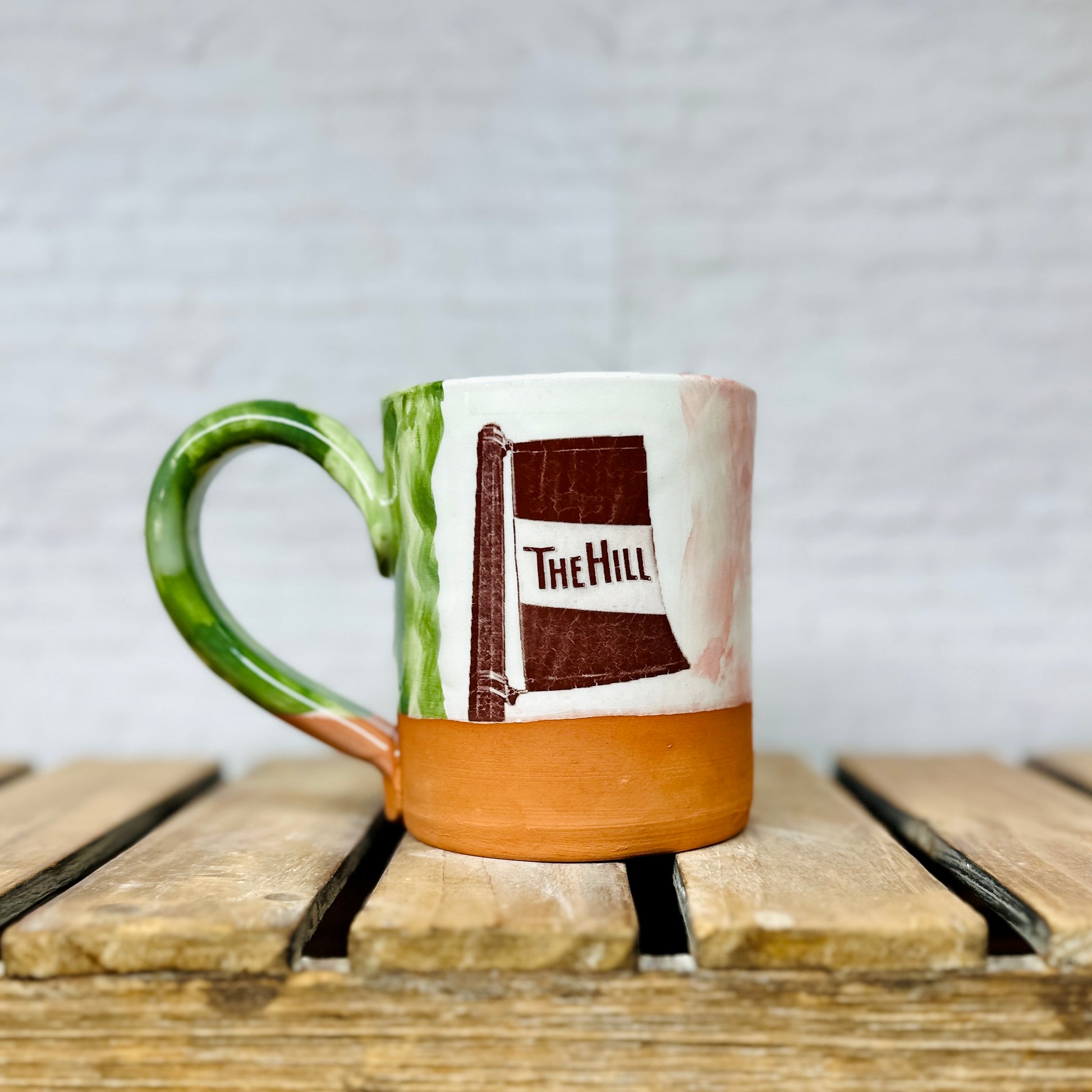 Celebrate your love for The Hill with this handmade ceramic mug, proudly adorned with the vibrant colors of the Italian flag. Perfect for sipping your favorite drink, it brings a playful splash of heritage and charm to every cup. Brighten your day and toast your roots with every cozy sip!